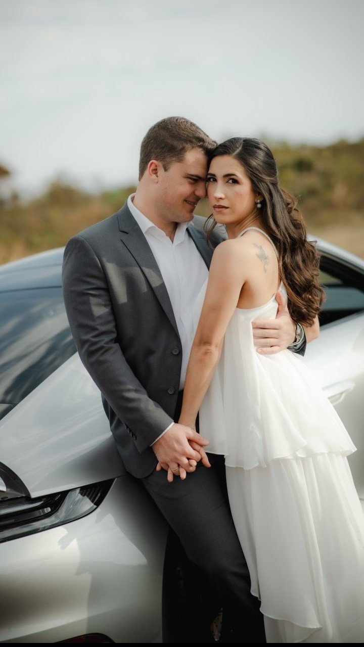 Versão do noivo: Em uma noite qualquer em 2022, saindo com amigos, algo longe de ''qualquer'' ocorreu. Vi uma mulher com cara e postura de brava mas que o seu sorriso a entregava como uma mulher linda e que me apaixonei. O sorriso foi viciante, escolhi uma cadeira estratégica para ficar sentado de frente para ela. Entre uma provocação e outra fui quebrando o gelo, e corri atrás dela para conseguir seu contato, consegui o Instagram, que ela me falou correndo, certa de que eu iria esquecer, mas o ''homi'' estava focado rsrsrsrs.